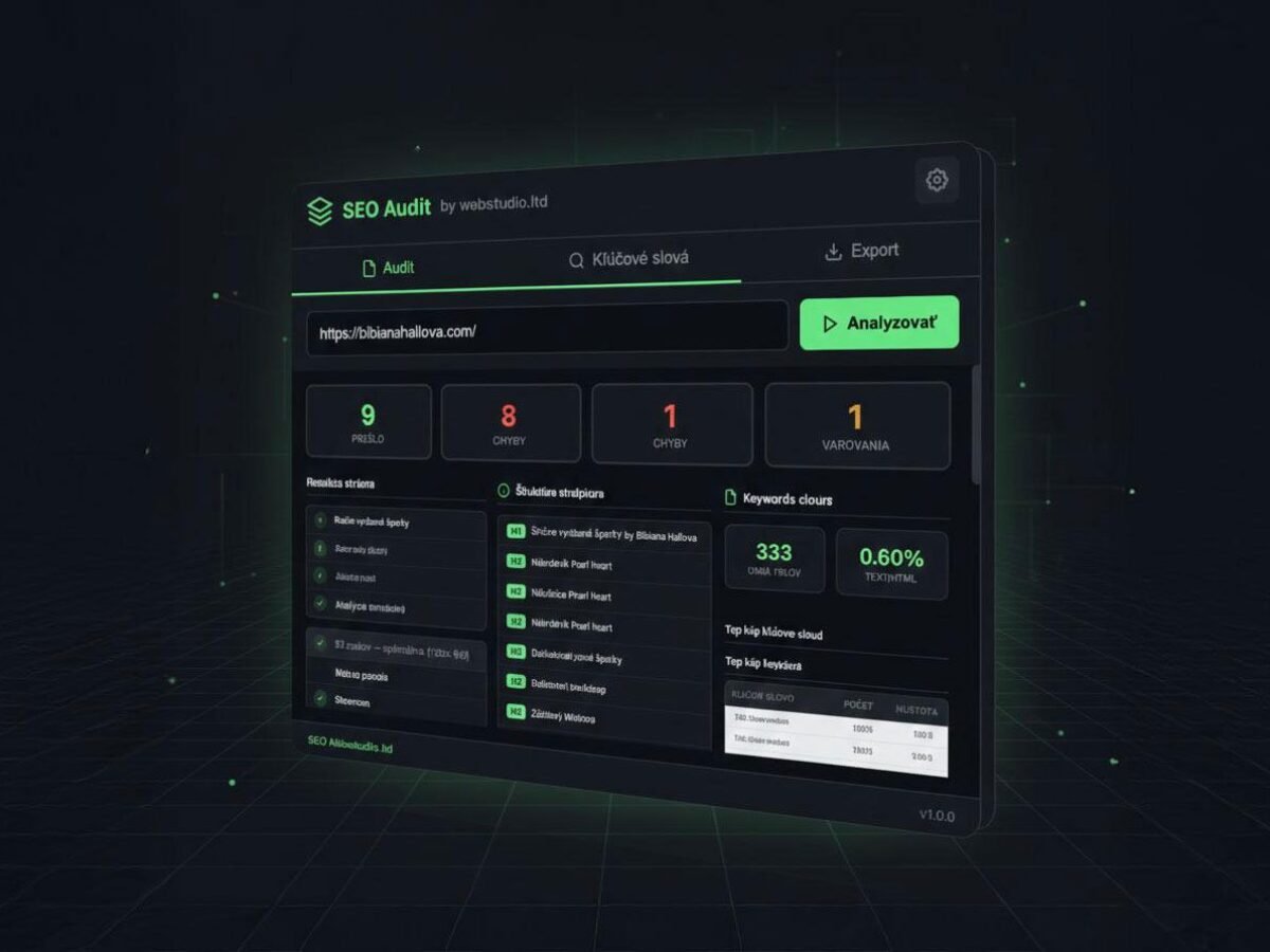 SEO Audit je praktický nástroj pre Google Chrome, ktorý slúži na okamžitú on-page analýzu akejkoľvek webstránky. Umožňuje marketérom a vývojárom rýchlo identifikovať technické nedostatky priamo počas prehliadania. Automaticky kontroluje titulky (Title), meta popisy (Description), štruktúru nadpisov (H1-H6) a alternatívne texty obrázkov. Overuje kanonické URL adresy, súbory robots.txt, sitemapy a indexovateľnosť stránky. Deteguje a kontroluje správnosť štruktúrovaných dát priamo na webe. Umožňuje vygenerovať a stiahnuť detailný White Label HTML report pre klientov alebo ďalšie spracovanie. Podpora jazykov: SK, EN, DE, FR, IT, RU
